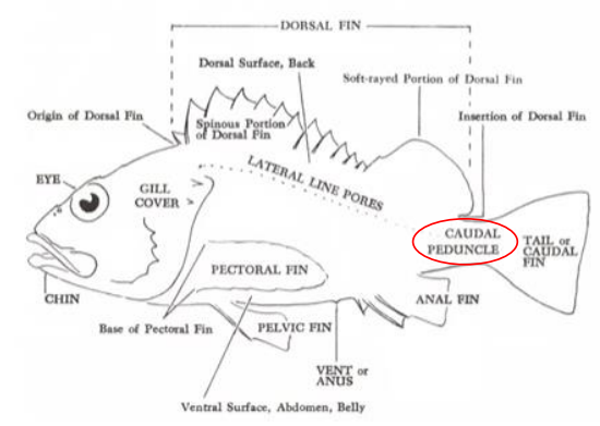 - Caudal peduncle(๋ฏธ๋ณ๋ถ) : ๋๋ฒ์งธ ๋ท์ง๋๋ฌ๋ฏธ ๋๋ถ๋ถ ~ ๊ผฌ๋ฆฌ์ง๋๋ฌ๋ฏธ์ ์์