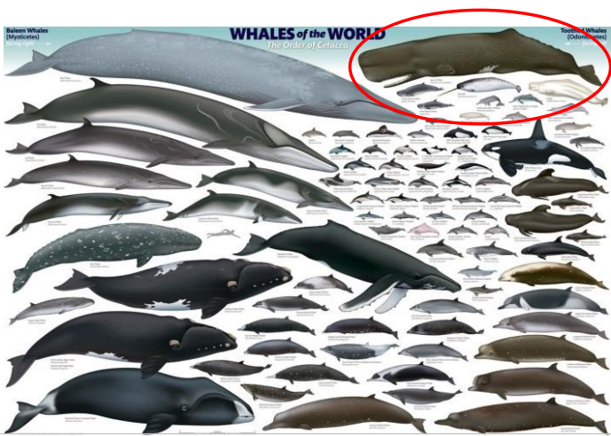 - 단, 향고래는 매우 큰데도 이빨고래 (이빨고래 중 가장 큼, 빨간 동그라미)