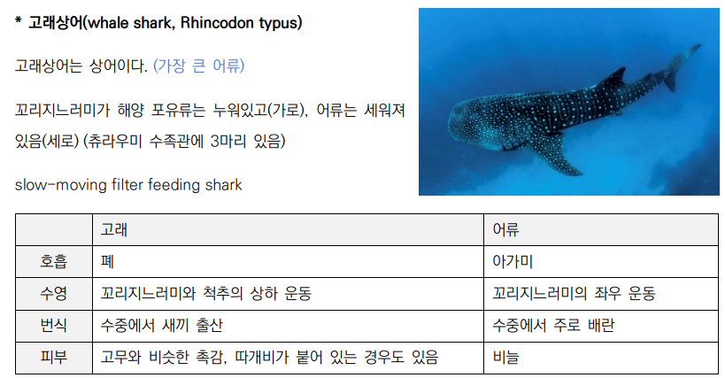 - 고래 : 폐호흡, 꼬리지느러미가 수평으로 누워 있고 상하로 물을 치며 움직인다, 수중에서 새끼를 출산하고 젖을 먹인다, 피부는 고무와 비슷한 촉감