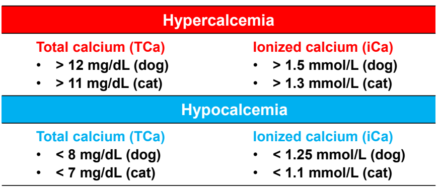 | - intact PTH | - Refernece range (dogs) : 0.5-5.8 pmol/L - Reference range (cats) : 0-4 pmol/L |