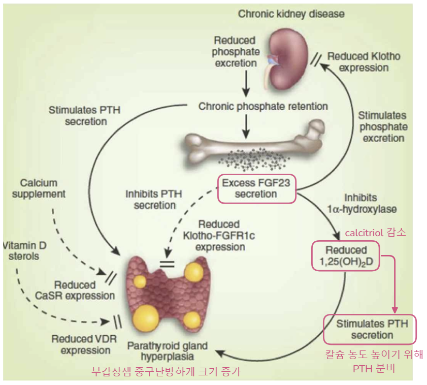 ![]() | ๊ณ ์ธ์ฐํ์ฆ(Hyperphosphatemia) โ FGF-23 secretion โ โ Calcitriol synthesis โ (์นผ์ ๊ฐ์, ์ธ ๊ฐ์) โ Ionized hypocalcemia โ PTH โ โ ๋ถ๊ฐ์์์ diffuse hyperplasia (= renal secondary hyperparathyroidism) |