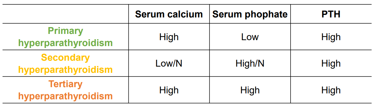- PTH๊ฐ ๋์์ง๋ฉด ๊ณ ์นผ์/์ ์ธ์ฐํ์ฆ์ด ๋ฐ์