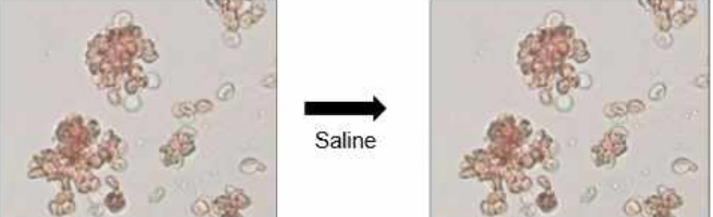 - “Rouleaux(염전)“과는 구분 필요. globulin 농도가 높아 엽전이 쌓인 모양처럼 보이지만, saline에 의해 풀어짐.