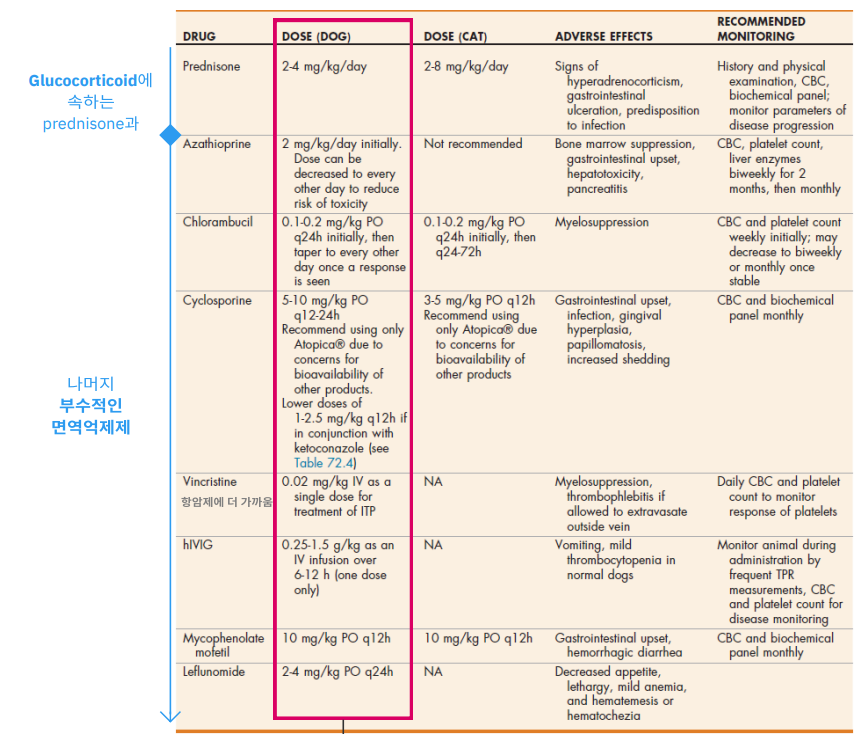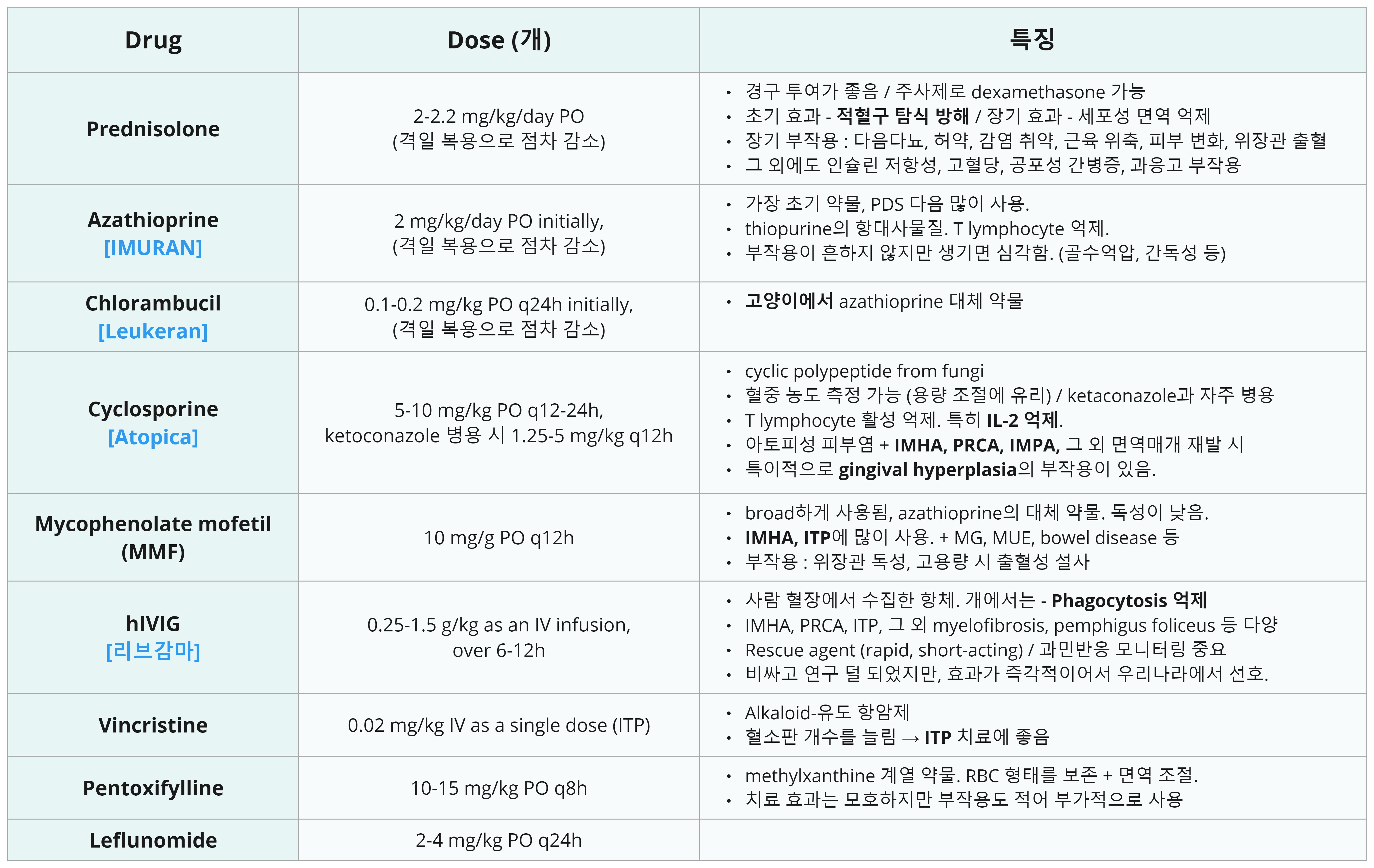 - 2선 약물로 자주 선택됨. (IMHA, ITP, IMPA, SLE, inflammatory bowel disease 등)