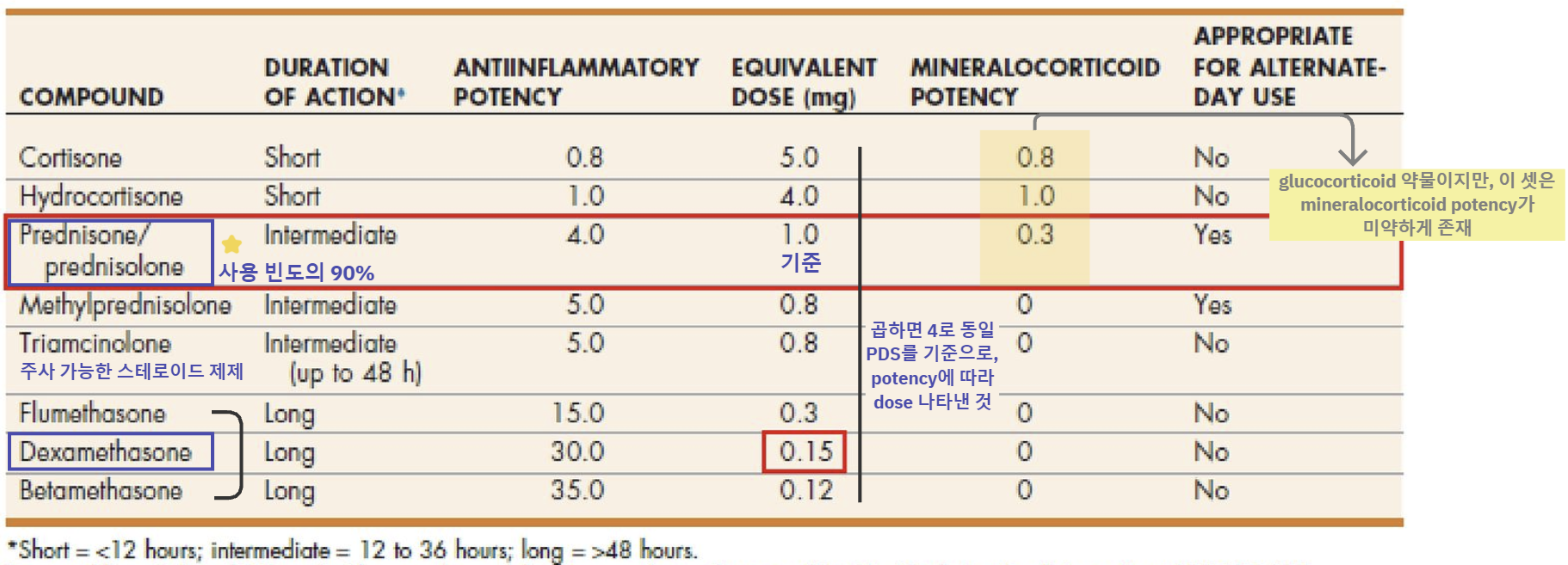 - Intermediate-acting | alternate day (격일 복용) | 2-2.2 mg/kg/day PO(=경구)