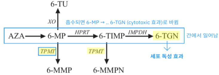 - azathioprine이 흡수되면 → 6-MP(mercaptopurine) → 간에서 많은 항대사물질이 생성됨.