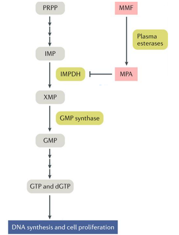- MPA(mycopenolic acid)로 대사 → IMPDH(inosine monophosphate dehydrogenase) 효소를 억제 (purine 합성을 방해) → 결과적으로 면역 억제 (B&T cell의 proliferation 억제, 항체 생성 감소)