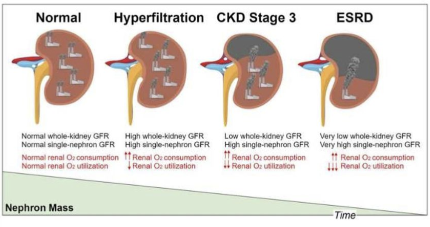 ์ ์ฅ ๋คํ๋ก ์ ์ผ๋ถ๋ถ์ด ์ฌ์ ํ๋๋ฉฐ ๊ฐ์๊ฐ ๊ฐ์. ์ ์ฒด์ ์๊ตฌ๋ ํผ. whole-kidney GFR์ ๊ฐ์, ๋ ์ฑ ๋ฌผ์ง ์ถ์ ๋จ.