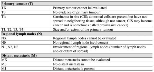 - M (metastasized) : ์ธ๊ทผ ๋ฆผํ์ , ๋ค๋ฅธ ์ฅ๊ธฐ๋ก ์ ์ด๋จ