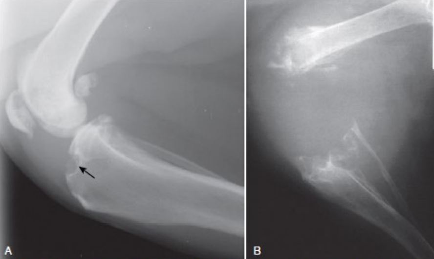 - ๊ด์ ์์ธก์์ ๋ผ์ ๋ณํ๊ฐ ๋ํ๋จ - subchondral bone & cortex์ lysis, new bone production