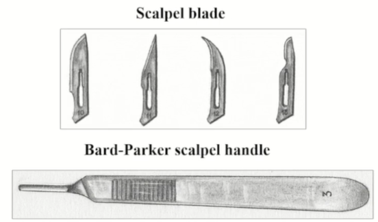 | Blade handle No.3 1 - 1 : 10호, 처음부터 끝까지 blade, 피부 절개 용도, 중대형견 - 2 : 11호, 뾰족함, stab incision - 조직을 찌를 때 (방광이나 위를 열어야 할 상황, submucosa는 절개로 어려움) - 3 : 12호, 낫/갈고리 모양, 조직 뒤쪽을 끊어낼 때, 고양이 declaw 할 때 뒤쪽 인대를 끊어내는 등 - 4 : 15호, blade 짧음, 피부에 사용되지만 소형견용 - Bard-Parker 3번에 장착 | ![]() |
