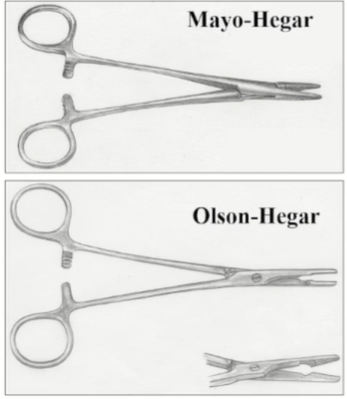 | Needle holder - Mayo-Hegar : 가장 일반적 - Olson-Hegar : 니들 홀드 jaw 뒤쪽에 scissor도 있음. 어시 확보가 어려운 환경에서 술자가 봉합+커팅 가능. - Castroviejo : 풀기가 훨씬 쉬워서, 안과나 혈관 봉합처럼 fine, micro 수술에서 용이. | ![]() |
