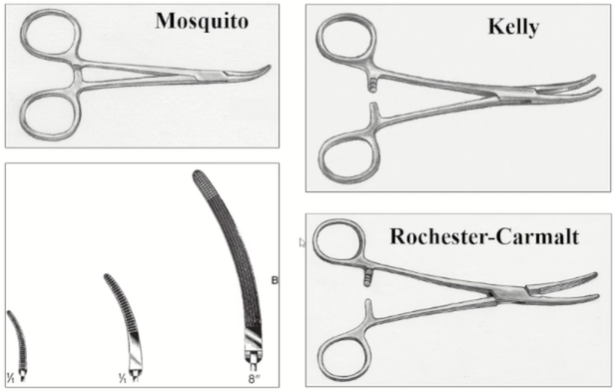 - Rochester-Carmalt: 큼. teeth가 처음부터 끝까지, 세로로. 큰 조직을 물고 가로로 늘려도 빠지지 않음.