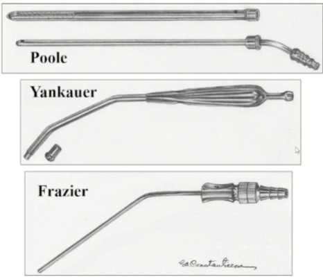 - Frazier : 끝에 구멍 하나 더 있어서 suction 압을 조절할 수 있음. 중요한 구조물이 주변에 있을 때는 압을 낮춤. 신경계, 척추 수술에 많이 사용됨.