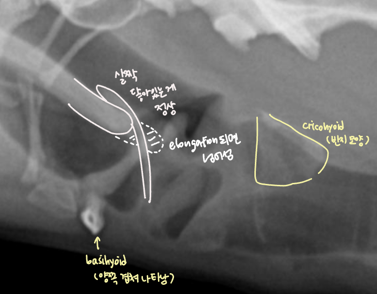 - English bulldog, Pug, Pekingese, French Bulldog, Bonston Terrier.. ์์ธ - Skull์ base๊ฐ ์ ์ ์ ์ผ๋ก ์งง์ - ๊ตฌ์กฐ์ ์ผ๋ก ์ผ๊ตด์ด ์งง์ ๊ตฌ์กฐ๊ฐ ๊ณผ๋ฐ๋จ Complex - stenotic nares (๋น๊ณตํ์ฐฉ) - soft palate edema & elongation (์ฐ๊ตฌ๊ฐ๋ ธ์ฅ) - laryngeal edema, saccules, collapase, paralysis - (dynamic) pharyngeal collapse GI complication - Hiatal hernia - gastroesophageal reflux (์ญ๋ฅ์ฑ ์๋์ผ) |