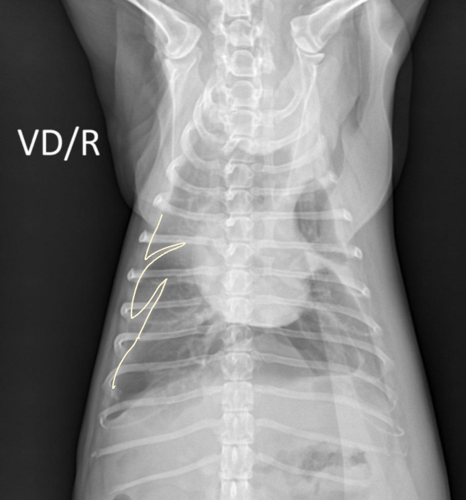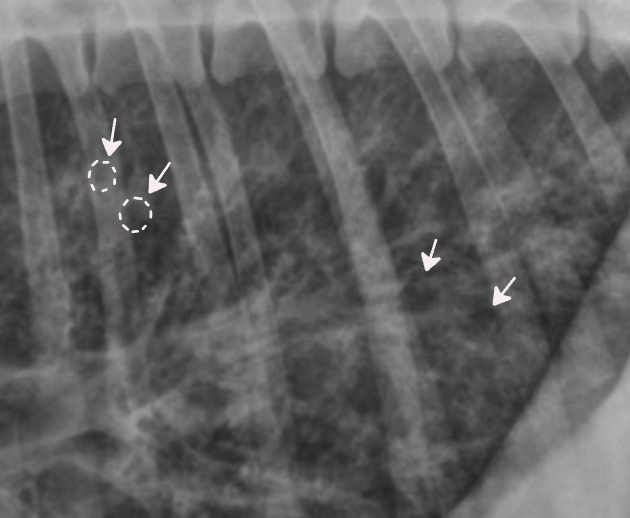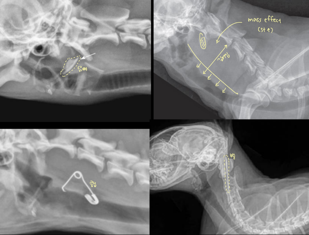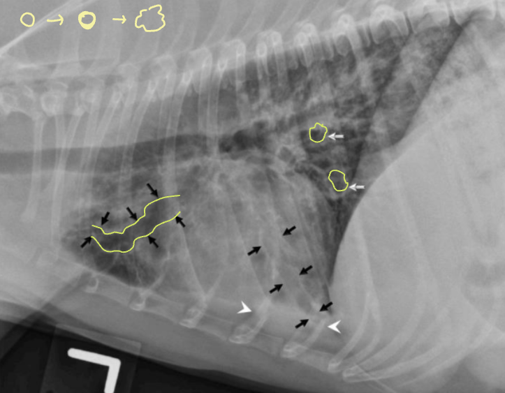 | ๊ด๋ จ ์ง๋ณ 3) Asthma [Feline Asthma] - Hyperlucent lung fields; โair-trappingโ (๊น๋ง ํ) - Tenting diaphragm - Bronchial patterns (๊ธฐ๊ด์ง ๋๊บผ์์ง, ์ผ์ฆ โ) |