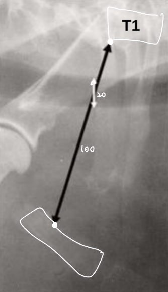 ![]() | - T1์ ๋๋ถ๋ถ์์, 1๋ฒ sternum์ ๊ฐ์ฅ ์ค๋ชฉํ ๋ถ๋ถ (Thoracic inlet)์ ์ ์ผ๋ก ์๊ณ ๊ธธ์ด๋ฅผ ์ฐ๋ค. - Trachea์ ๊ธธ์ด๋ฅผ ์ฐ๋ค. - ๋น์จ์ ๋ณดํต 0.2 ์ ๋. ![]() (๋จ๋์ข ์์๋ ์ ์์ ์ผ๋ก ๋ ์๋ค.) |