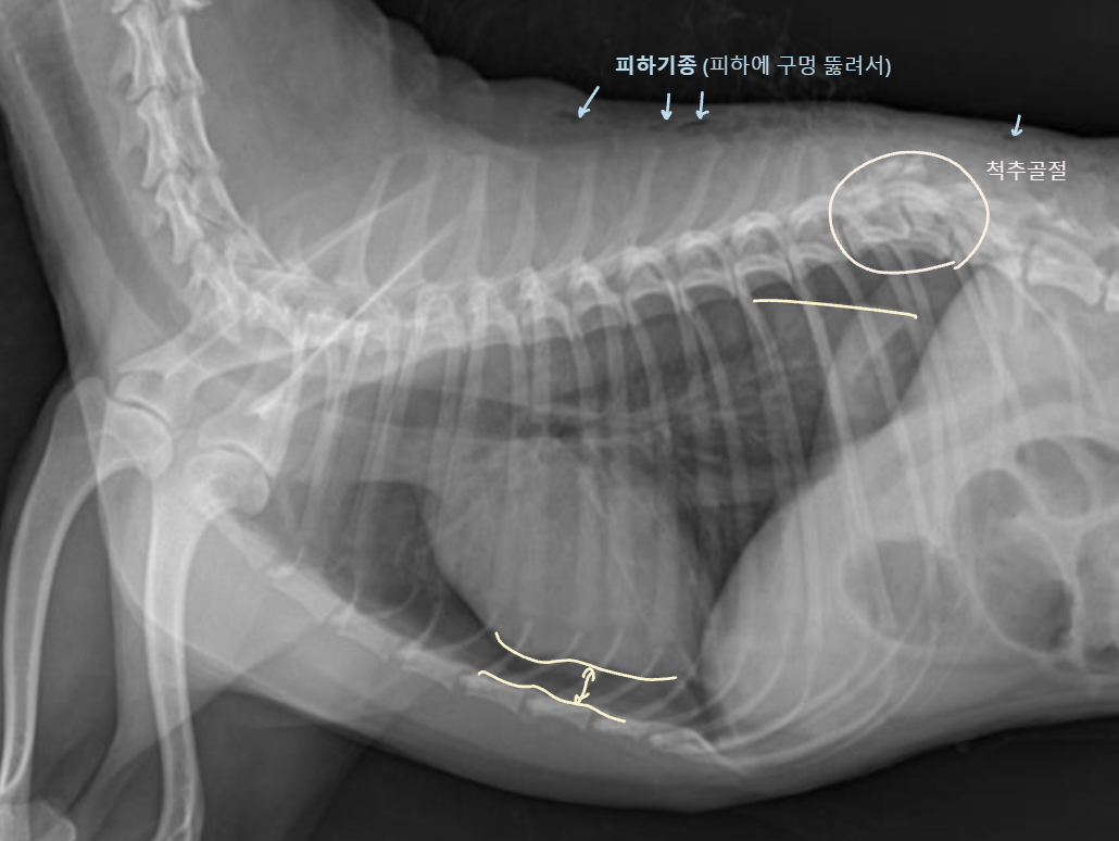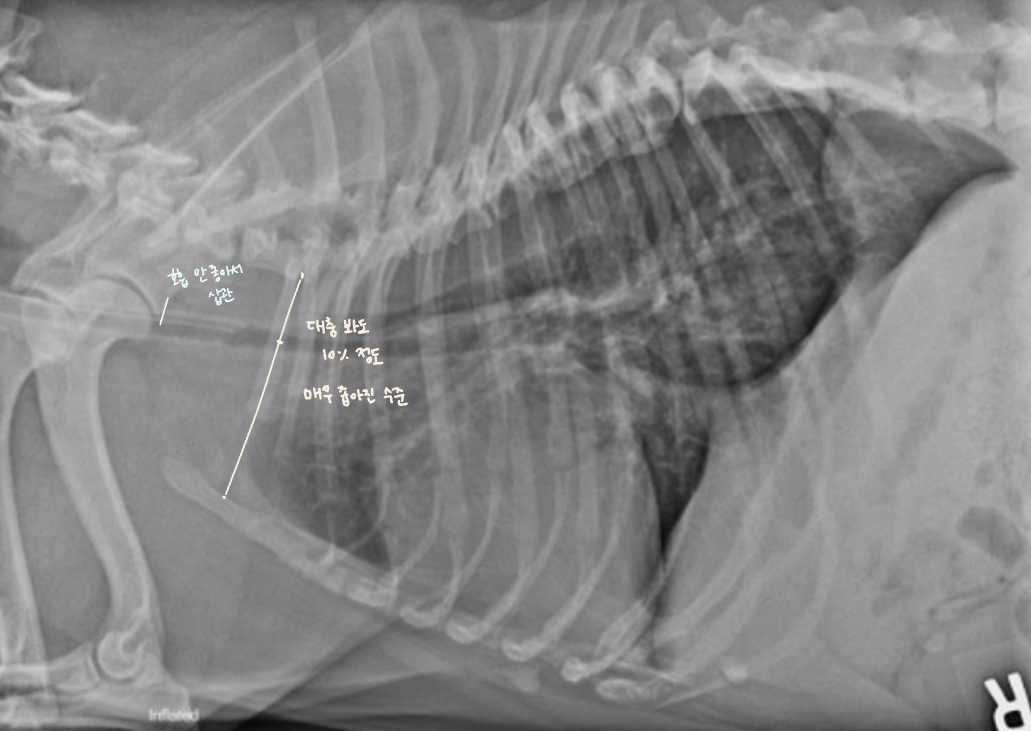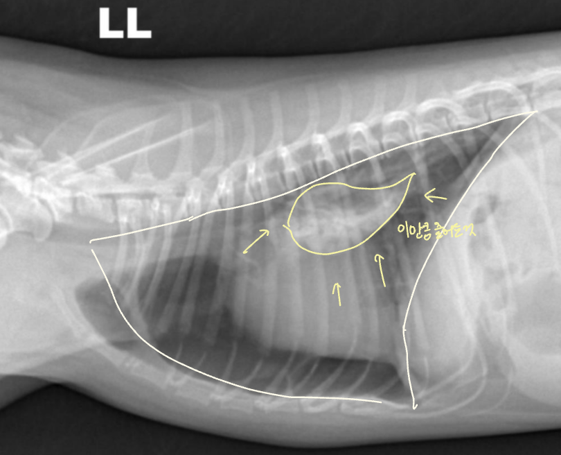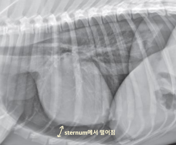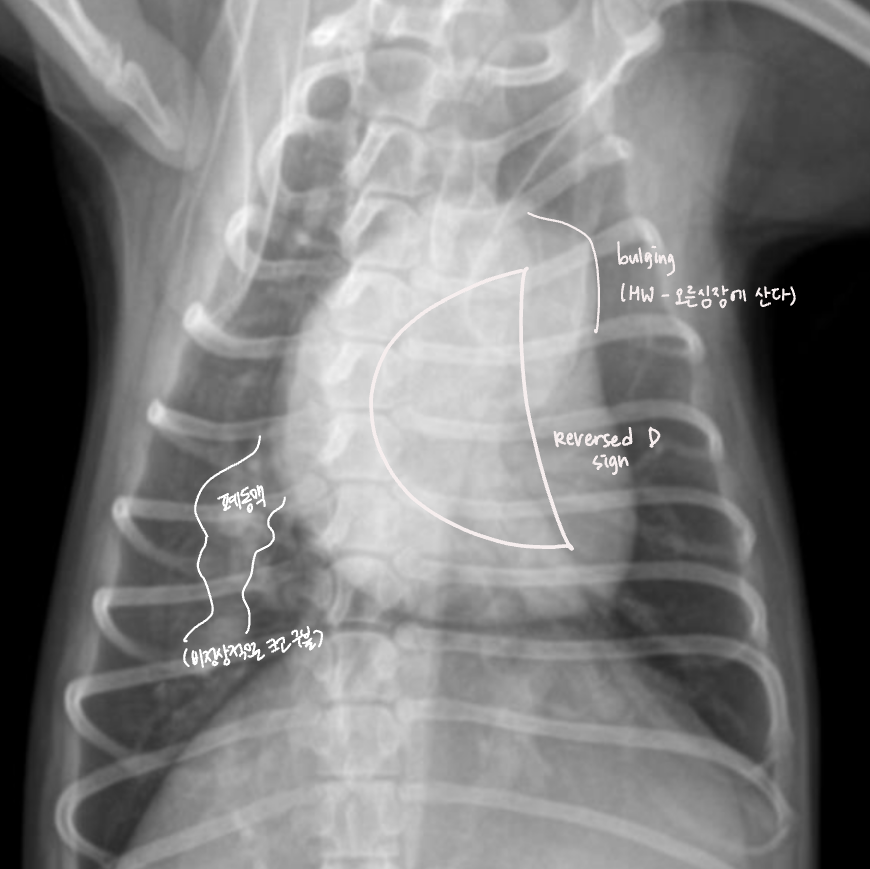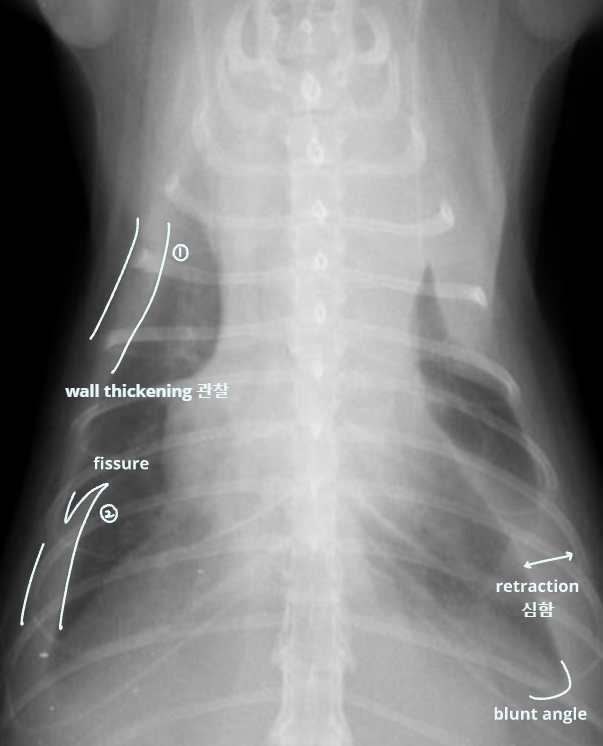 | Radiographic signs interlobar fissure ๋๊ป๊ฒ ๊ด์ฐฐ๋๊ณ , ํ๋ฒฝ์ด ๋จ์ด์ ธ ๋๊ฐ ๊ฒ์ฒ๋ผ ๋ณด์ | Radiographic signs ์ฌ์ฅ์ด ๋ ์๊ณ , ํ๊ฐ ์ชผ๊ทธ๋ผ๋ฆ | |