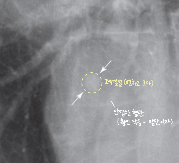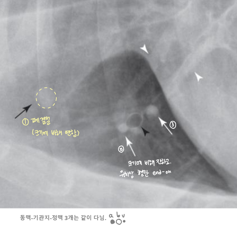 | Radiographic sign - Consolidation (ํ๊ฒฝํ; ๊ณต๊ธฐ ์ธ ๋ค๋ฅธ ๊ฒ ์ฐธ) - Lobar sign (์ฝ๊ณผ ์ฝ ์ฌ์ด ๊ฒฝ๊ณ๊ฐ ๋๋ฌ๋จ) - Air bronchogram; โTrees in the fogโ (ํ์ฝ์ด ์ฐจ์ ๊ธฐ๊ด์ง๊ฐ ๋๋ฌ๋จ) - Cardiac effacement |