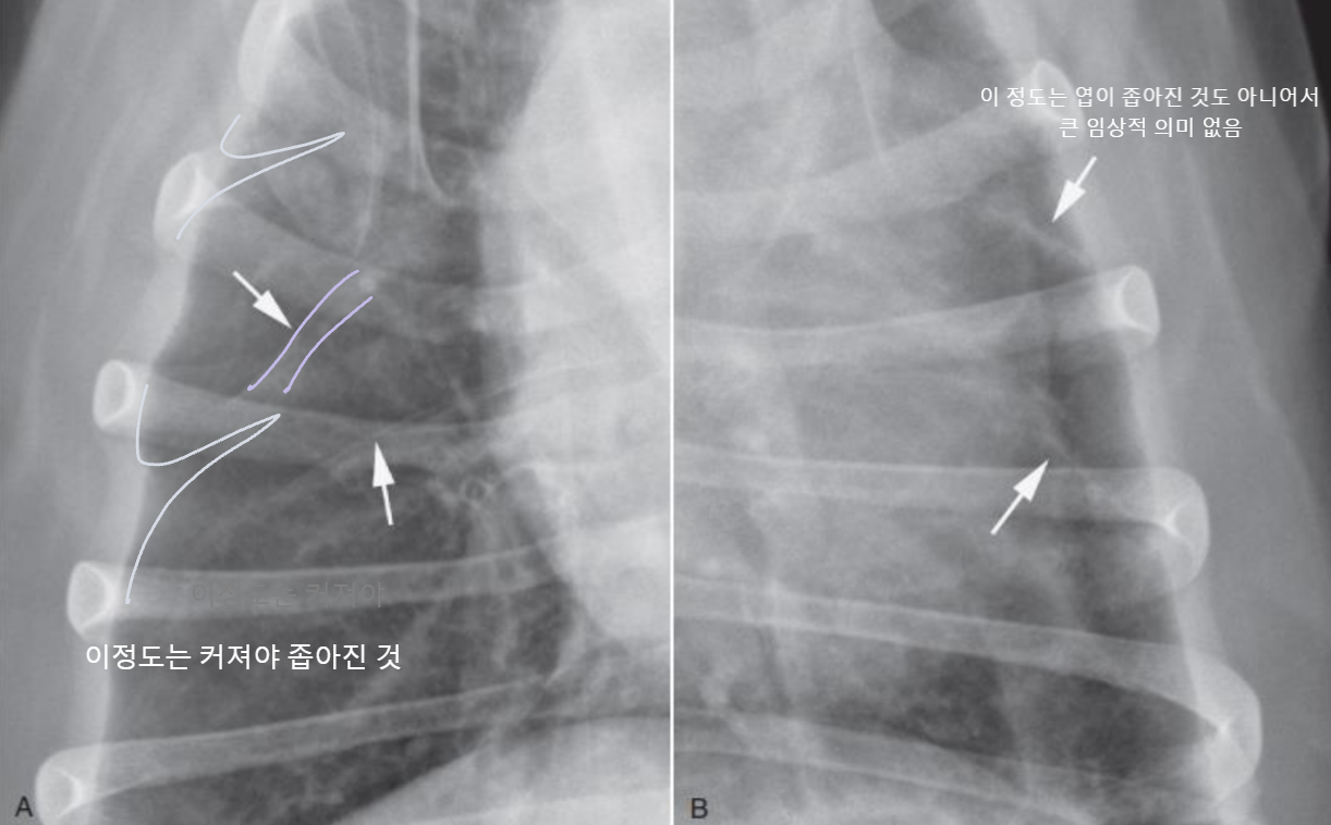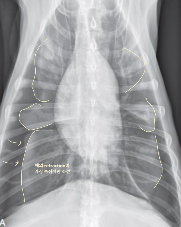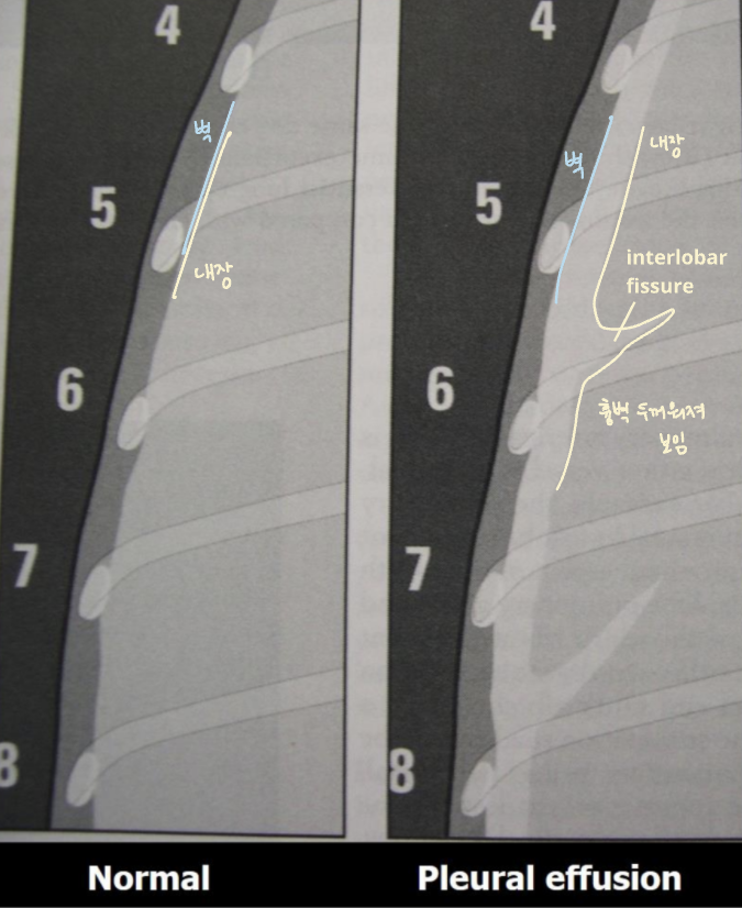| - Interlobar fissure widening - Lung retraction - Pleural wall thickening - Scallop sign - Cardiac effacement - Blunt angle | - Retraction of pleural surface - Collapsed lung (โ opacity ์ฆ๊ฐ) | |