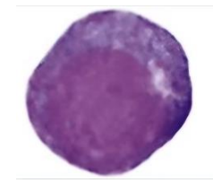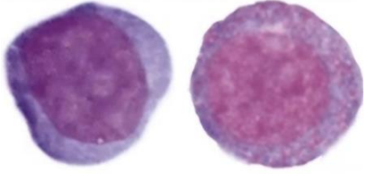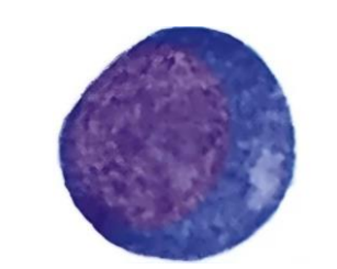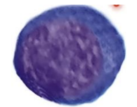 | Rubricyte | - ์ค๊ฐ ~ ์์ ํฌ๊ธฐ์ ์ธํฌ - ์๊ฑฐ๋ ์ค๊ฐ ์ ๋์ ์ธํฌ์ง, ํธ๋ฅธ์-์ฒญํ์-์ฒญ๋ถํ์ ์ผ์ - ๋ฅ๊ทผ ํต ๋ด์ ํต์์ฒด๊ฐ ๊ด์ฐฐ๋์ง ์์. - Coarse clumped chromatin pattern |