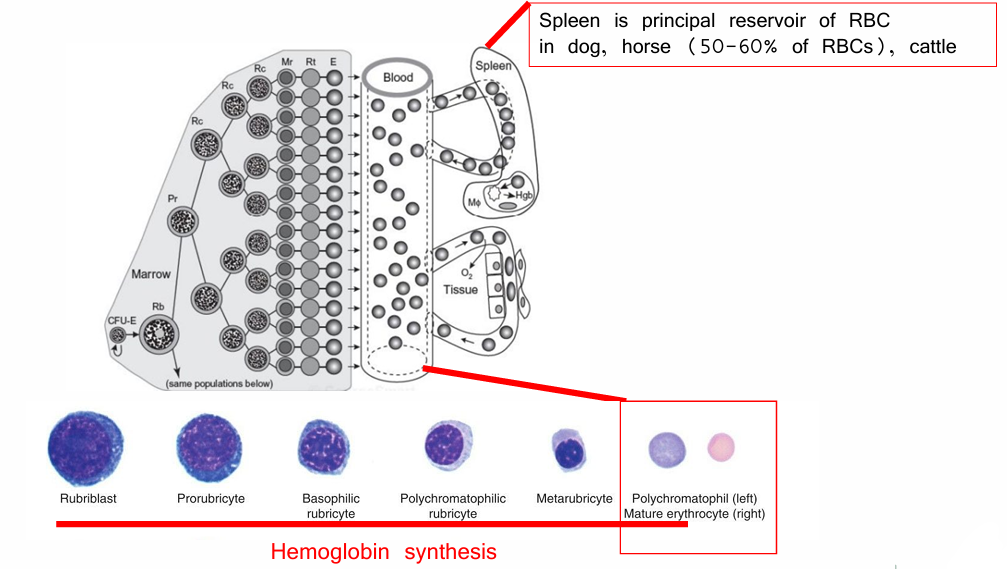- Hemoglobin ํฉ์ฑ์ rubriblast โ reticulocyte๊น์ง, ์ฆ mature RBC๊ฐ ๋๊ธฐ ์ ๊น์ง ์ง์์ ์ผ๋ก ๋ํ๋๋ค.