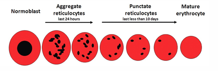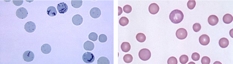 - Reticulated form(๊ทธ๋ฌผ ๋ชจ์)์ผ๋ก ์ผ์์ฑ์ด ์กด์ฌํ๊ธฐ ๋๋ฌธ์ โreticulocyteโ ๋๋ โpolychromatophilic erythrocyteโ๋ผ๊ณ ๋ถ๋ฅธ๋ค.