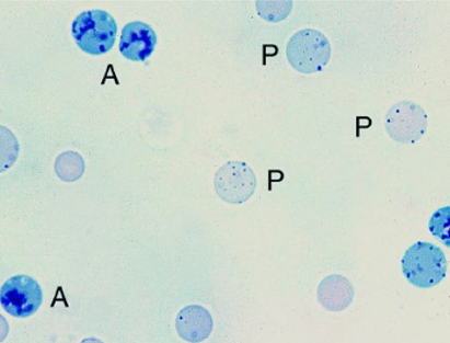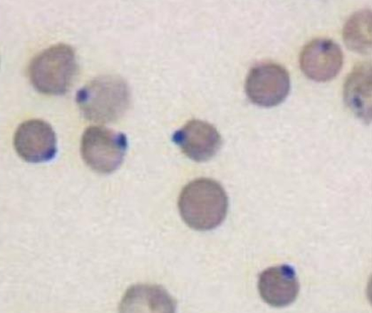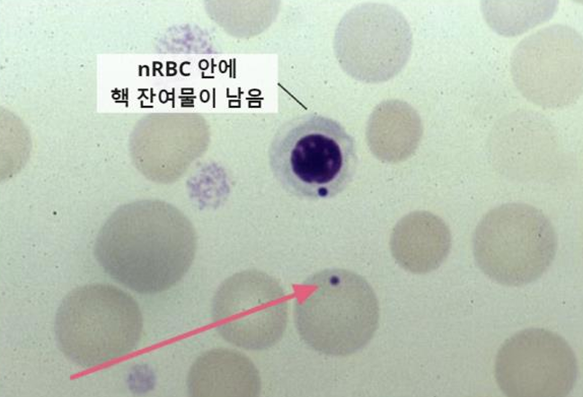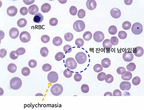 - ๊ทธ๋ฌ๋ ์ฌ์ ํ ์ผ์๋ ์ ์๋ RNA ์์ฌ๋ฌผ๋ค์ด ์ธํฌ์ง์ ๋จ์์๊ธฐ ๋๋ฌธ์ RBC์ฒ๋ผ ๋ช ํํ๊ฒ ํธ์ฐ์ฑ์ ๋ ์ง๋ ์๊ณ , metarubricyte์ฒ๋ผ ์ฌ์ ํ ํธ์ผ์ฑ๊ณผ ํธ์ฐ์ฑ์ด ์์ฌ ์๋ ์ผ์์ฑ์ ๋ํ๋ธ๋ค.