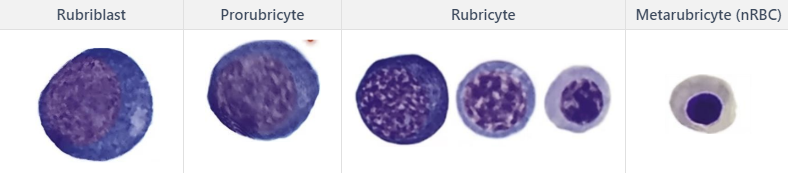 - CFU-E โ rubriblast(Rb) โ prorubricyte(Pr) โ rubricyte(Rc)๋ก ๋ถ์ดํ๊ณ ,