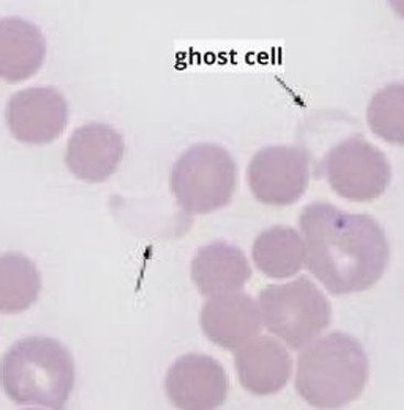 - Ghost cell์ RBC ์์, ํนํ intravascular hemolysis์ ์ค์ํ ํน์ง์ด๋ค.