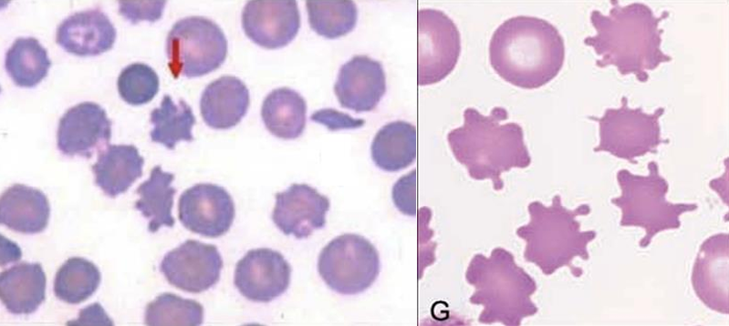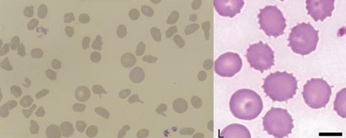 Echinocyte![]() | - RBC fragment์ฒ๋ผ ๋ณด์ด๋ ๋ถ๊ท์นํ spicule์ ๊ฐ์ง๊ณ ์์. |