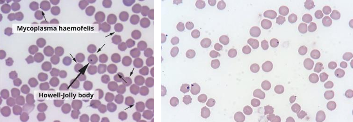 Mycoplasma haemofelis![]() | - Howell Jolly์ ๋น์ทํ๋, - cytoplasm ๋ด์ธก์ ์กด์ฌํ๋ Howell-Jolly์ ๋ฌ๋ฆฌ Mycoplasma haemofelis๋ cell membrane์ ๊ฐ๊น๊ฒ ์์นํ๊ณ , 400๋ฐฐ์์ ๋ณด๋ฉด ํต ์์ฌ๋ฌผ๊ณผ ๋ฌ๋ฆฌ ์์ roundํ ํํ๊ฐ ์๋. - PCR ์ง๋จ ํ์. |