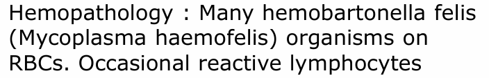 ![]() | - Blood film ํ๋ฏธ๊ฒฝ ๊ด์ฐฐ - Hemobartnella felis, Mycoplasma haemofelis ๊ด์ฐฐ๋จ โ Parasite ๊ฐ์ผ์ ์ํ Hemolystic anemia - Reactive lymphocyte๊ฐ ๊ด์ฐฐ๋จ โ ๊ฐ์ผ์ฑ ๋ณ์์ฒด์ ์ํฅ |
