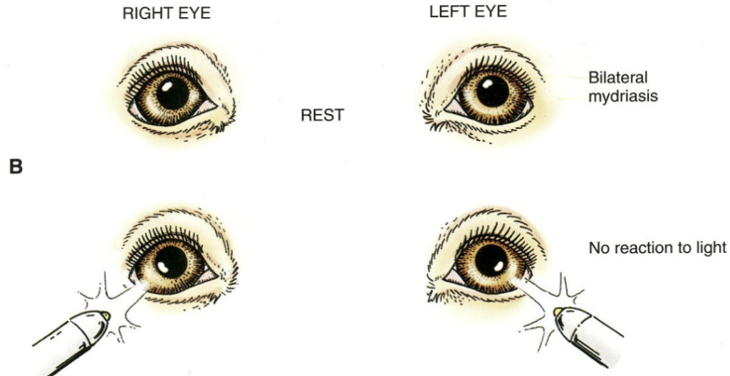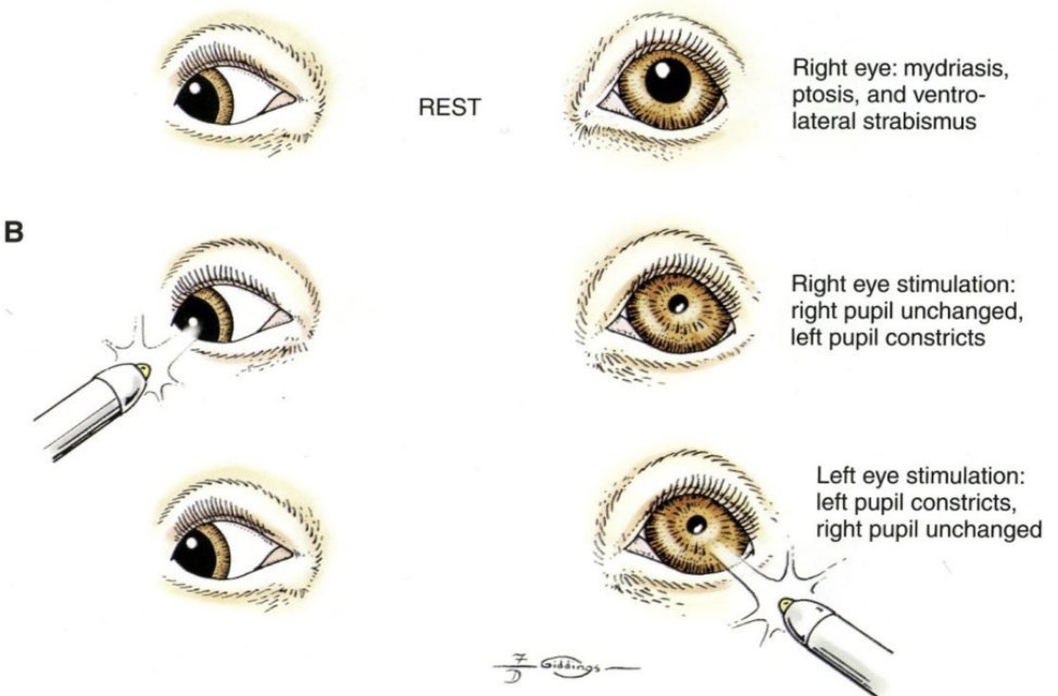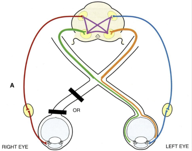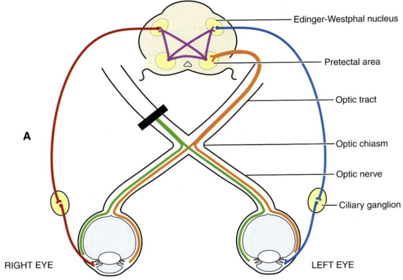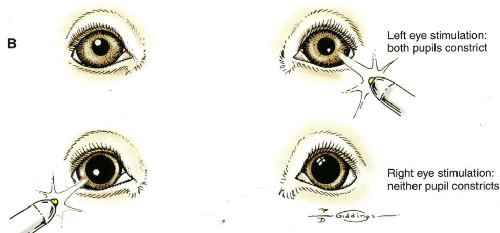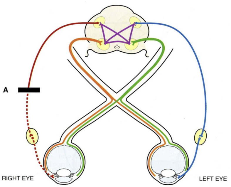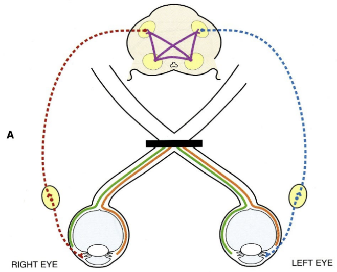 Optic chiasm ์์![]() | - ๊ธฐ๋ณธ์ ์ผ๋ก ์ฐ๋ ์ํ. (์ถ๋์ด ์ ๋จ) - ์์ชฝ ๋ ๋ชจ๋ ๋น์ ๋น์ถฐ๋ ์ถ๋ ์์. - ์ด๋ค ์๊ทน์ ๋ํ ๋ฐ์๋ ์๊ณ (dazzle reflex ํฌํจ), ์ค์ ๋ก ๋ณด์ง๋ ๋ชปํจ. ![]() |