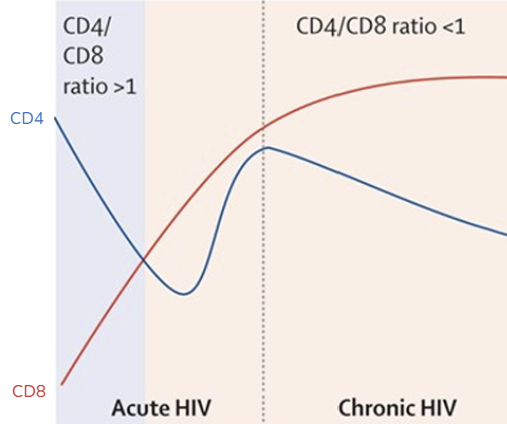 | Hematologic | ![]() - ์ ์ ๋ฉด์ญ ์ํ์์๋ CD4/CD8 > 1 ์ํ๋ฅผ ์ ์งํ๊ณ ์์. - Acuteํ๋ฉด CD4๊ฐ ๊ธ๊ฒฉํ ๋จ์ด์ง๊ณ CD8์ด ๊ธ๊ฒฉํ ์ฆ๊ฐํด์ <1 โ Ratio๊ฐ ์ญ์ ๋จ! |