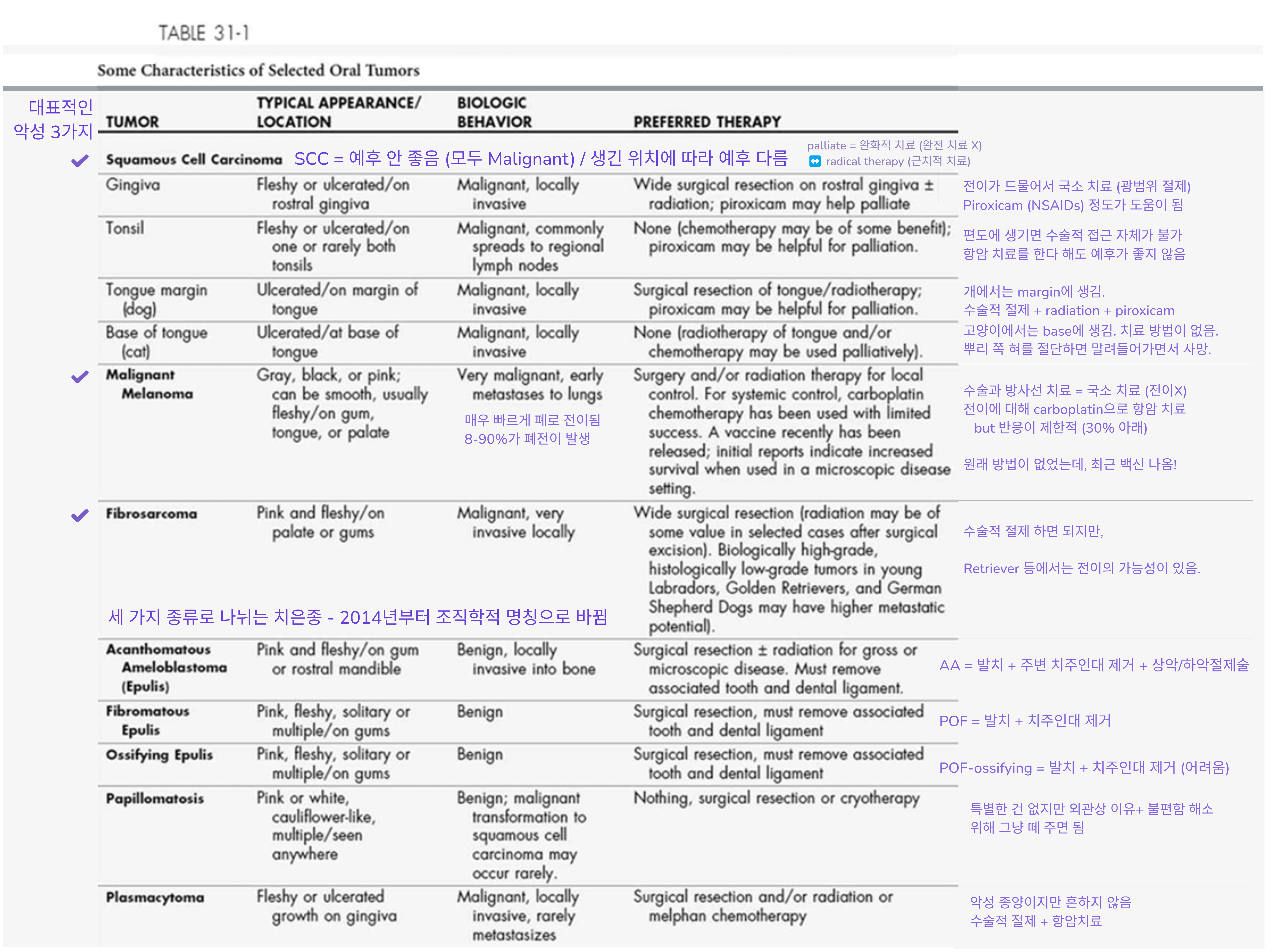- 악성 종양으로 melanoma (흑색종), 양성 종양으로 Epulis