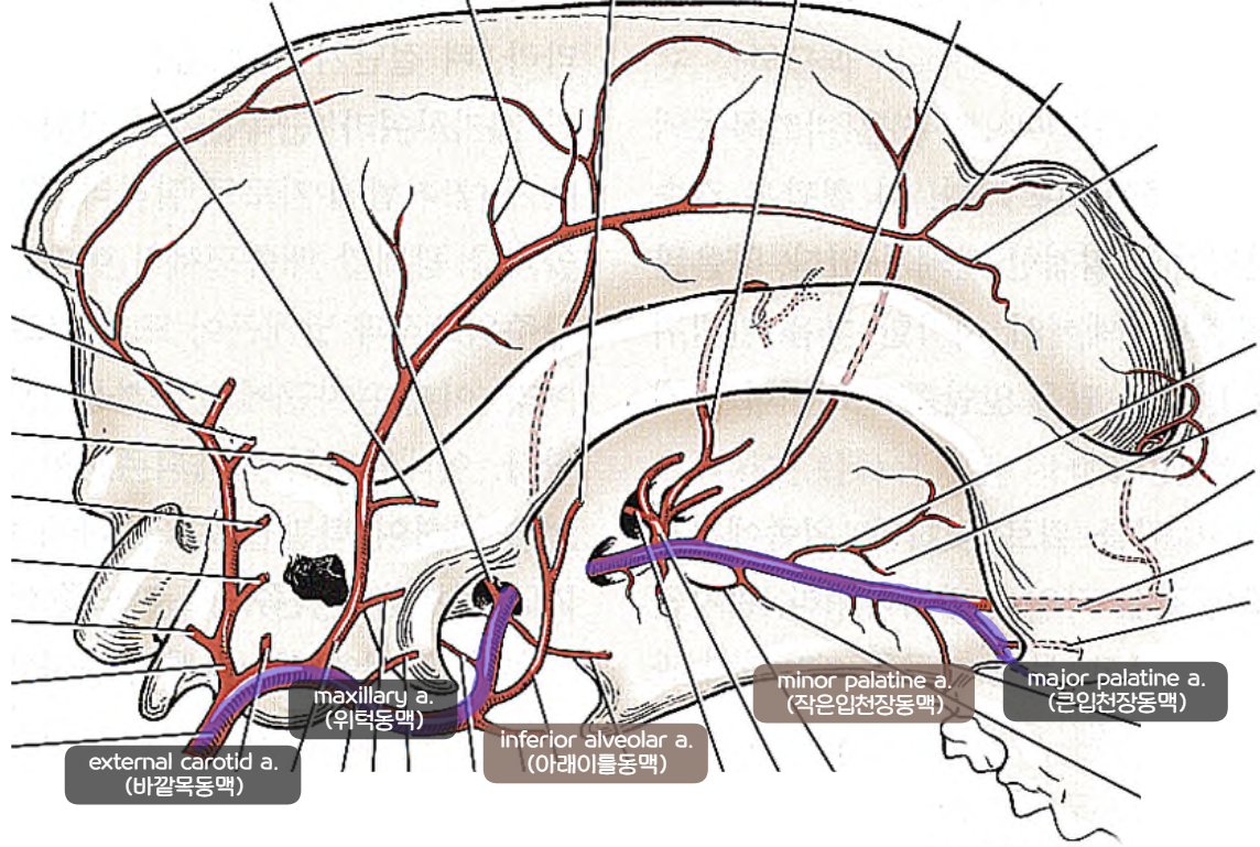 - 위턱의 주된 혈액공급은 major & minor palatine a. (큰/작은입천장동맥; 입천장에서 정중앙을 기준으로 기준 양측 위치)