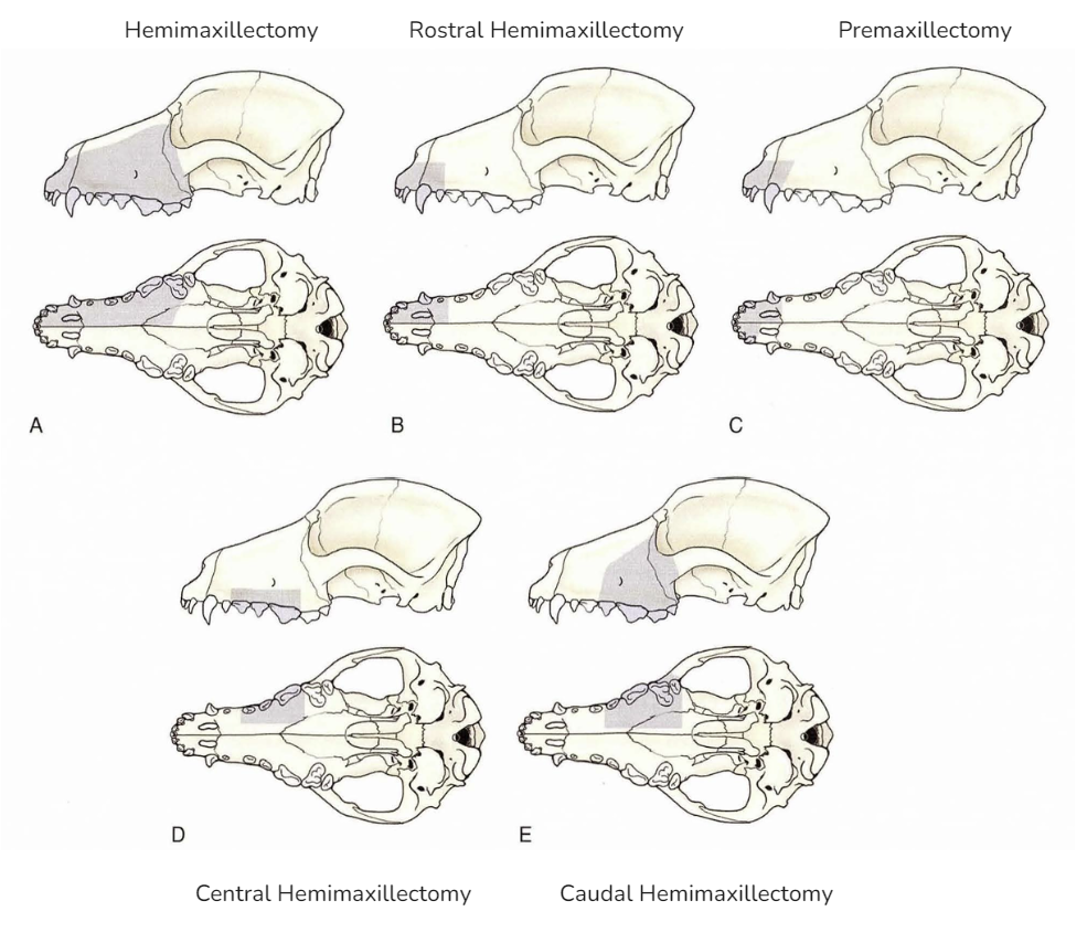 | Rostral hemimaxillectomy | I, C, PM1까지 절제 (105/205 정도까지) |