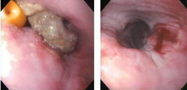 - 내시경으로 식도의 개통성을 확보했다면, 다시 내시경을 천천히 꺼내면서 관찰하고, 천공을 확인하기 위해 X-ray 촬영이 필요.