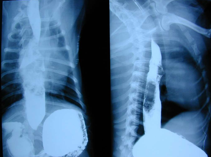 - 고형 식이 등은 통과하지 못함 → 식도 협착 앞부분에 저류됨 → 해당 부위에 식도의 확장 발생