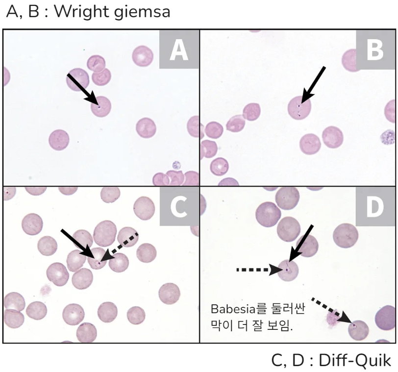 | Atypical | ํ์ก์๋ ์๋๋ฐ ๋ณต์/์ฌ๋ญ์์์ DNA๊ฐ ๊ฒ์ถ๋๊ธฐ๋ ํจ. ์ ํ์ ์ธ Babesiosis ์ฆ์์ด ์๋๋ผ๋ ์ฒด์ก์์ ๊ฒ์ถ๋๋ ๊ฒฝ์ฐ๊ฐ ์์. |