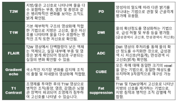 | FLAIR | T2 영상에서 하얗게 보이는 CSF 신호를 억제. 뇌척수액은 어둡게, 병변은 밝게 ⇒ 뇌척수액과 병변 감별 |
