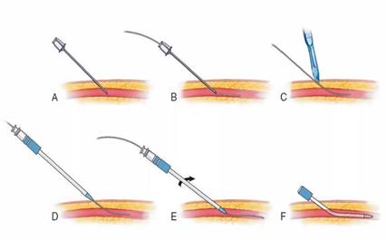 ![]() | 1. needle로 혈관을 뚫는다 2. 가이드 와이어 장착 3. Sheath(통로)&dilator를 같이 넣어줌 |