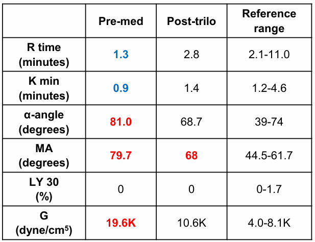 | TEG ๊ฒ์ฌ - ๊ณผ์๊ณ ์ํ, ํ์ ๊ด๋ จ ๊ฒ์ฌ๋ ์งํ - R, K ๊ฐ ๊ฐ์ / ฮฑ, MA ๊ฐ ์ฆ๊ฐ - ์น๋ฃ ํ ์ ์ํ๋จ. |