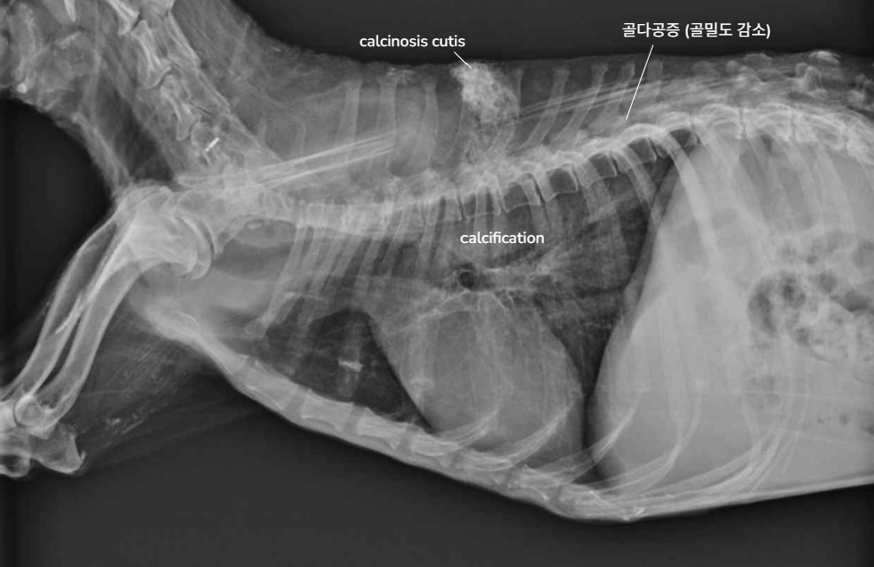 | - Bilaterally symmetrical alopecia (head&limb๋ ๋จ์์์) - Dry and lusterless haircoat (Curlyํ hair๊ฐ ์ง๋ชจ์ฒ๋ผ ํด์ง) - Variable hyperpigmentation - Hypotonic - Phlebectasias - Comedones (๋ธ๋ํค๋์ฒ๋ผ ๋ณด์) & milia - Calcinosis cutis (mineralization โ ๋ง์ก์ ๋ ๋ ๋ฑ๋ฑํ๊ณ , ์ฌ๊ฐ์ฌ๊ฐํ ๋๋) - Cutaneous ossification (์นผ์ํ๋ฅผ ์ค๋ ๋ฐฉ์นํ๋ฉด ๊ณจํ์ฒ๋ผ ์งํ, ์๋ผ๋ด์ง ์์ผ๋ฉด ์ด๋ป๊ฒ ๋ชปํจ..) |