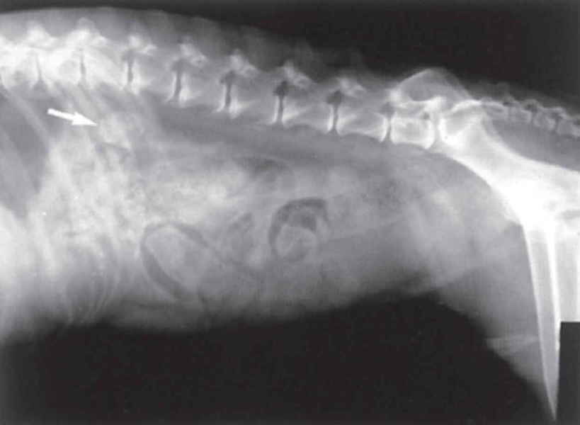 | Radiography (Abd.) - Excellent abdominal detail - Hepatomegaly - Distention of urinary bladder - Cystic calculi - Adrenal mass - Calcified adrenal gland - Dystrophic calcification of soft tissues, calcinosis cutis - Osteoporosis of vertebrae | ![]() |
