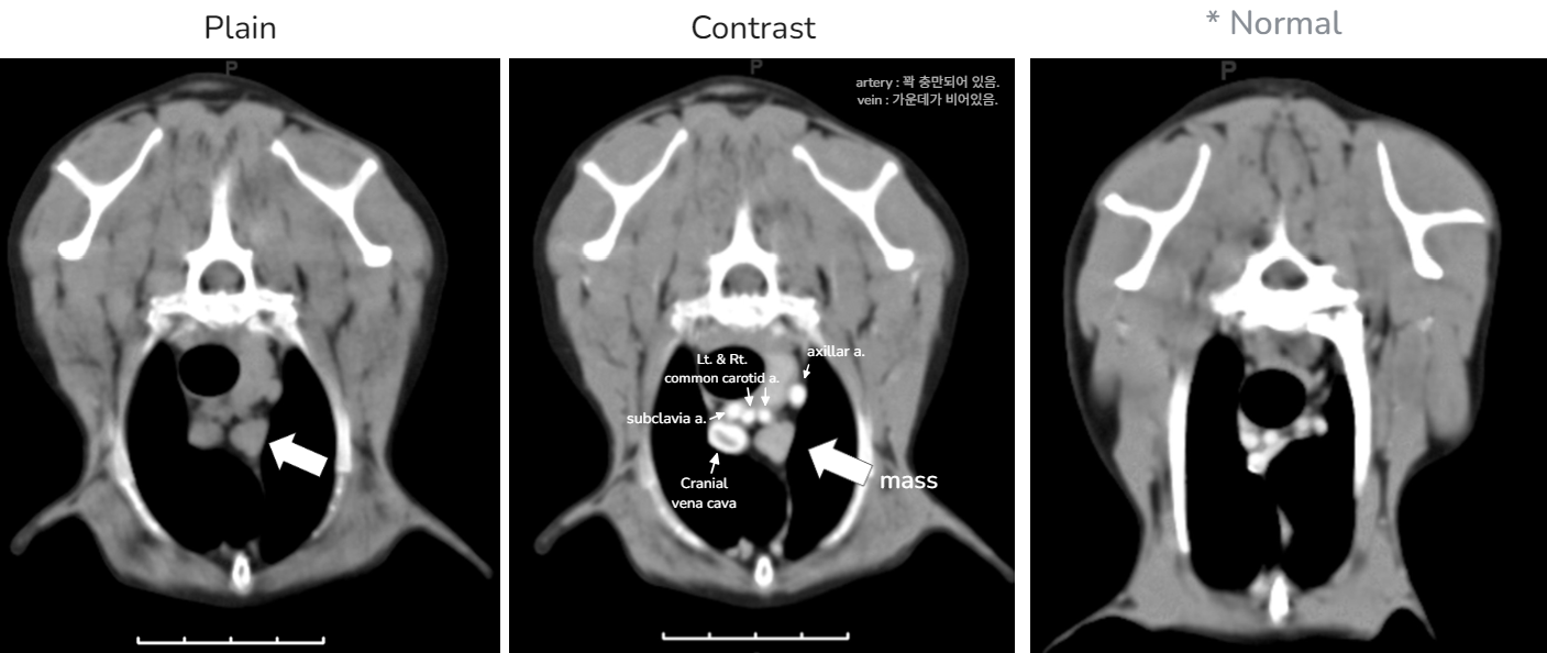 - ๊ทธ๋ฐ๋ฐ artery๋ vein๋ ์๋ ๋ฌด์ธ๊ฐ๊ฐ ์๋ค - ๋๊ฒ ์์์ X-ray์์๋ ๋์ค์ง ์์.โ CT์ ์์ thymoma๊ฐ ๊ด์ฐฐ๋จ.