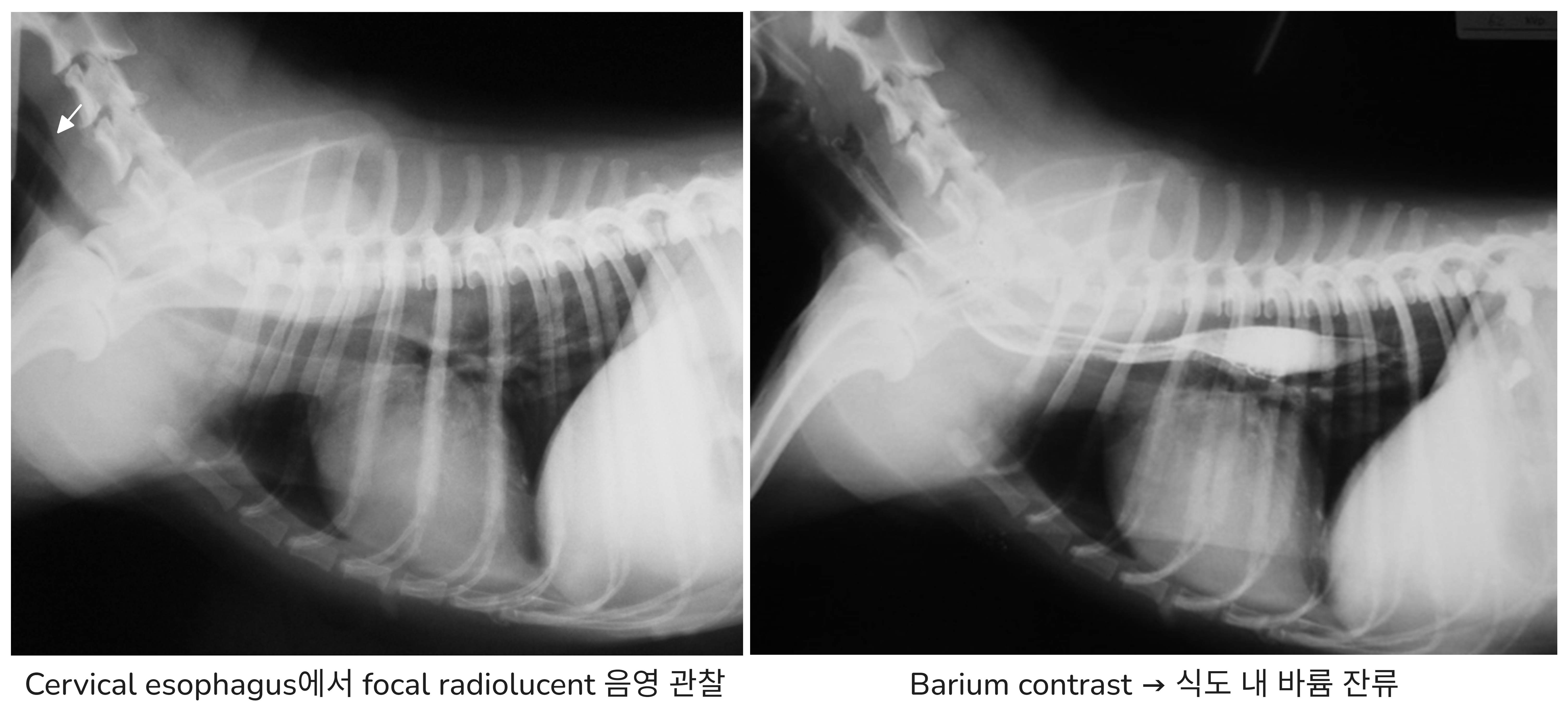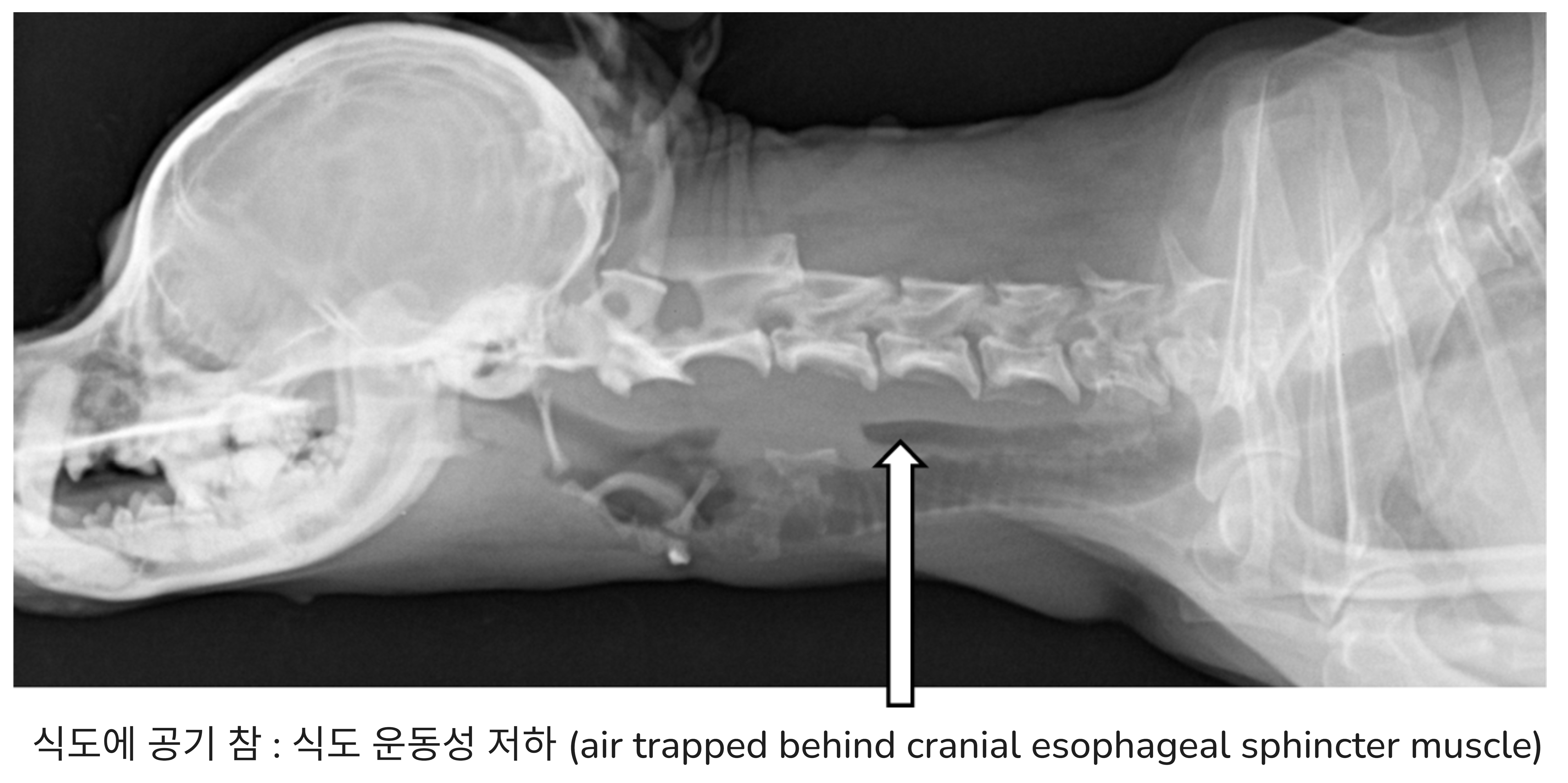 - ๊ฒฝ๋ถ esophagus๊ฐ ํ์ฅ๋๊ณ , ๊ณต๊ธฐ๊ฐ ์ฐจ ์์ (๊ฒ์์)