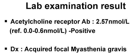 Serum Ach receptor Ab ์์ฑ (2.93nmol/L)