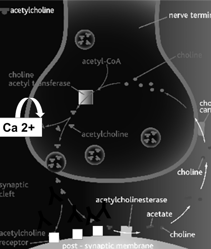 ์ ๊ฒฝ ์ ๋ฌ ๊ณผ์ choline acetyl transferase์ ์ํด acetyl CoA๊ฐ acetylcholine์ผ๋ก ๋ฐ๋, ์ด ๊ณผ์ ์ ์์ฉํ๋ ๋ฏธ๋ค๋์ด Ca2+.